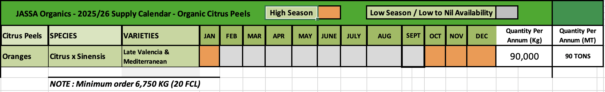 JASSA Organics has an unwavering commitment to the sensory and aesthetic requirements of our customers. As we supply peels to different sectors; we recognise that customers’ needs will vary. Let us know your required parameters in relation to the maturity and colour indices of our organic certified citrus peels.